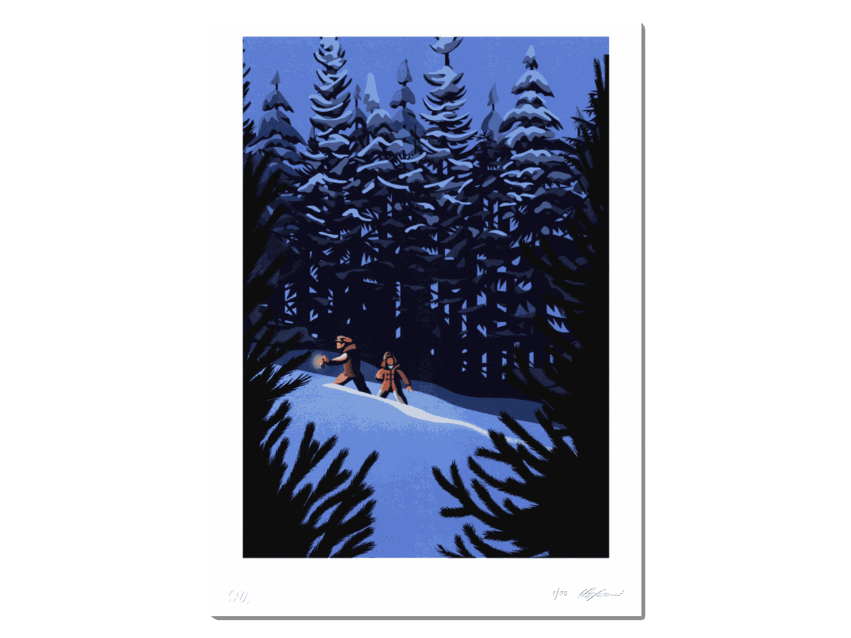 Fuga nella neve Limited edition of 50 hand signed, numbered and embossed fine art print. Size 297×420 mm Shipping costs included in Europe.